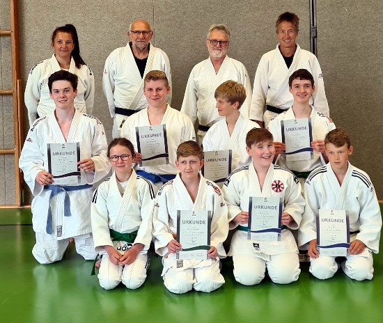 Unter den strengen Augen der Prüfer (v.li) Claudia Marsch, Rainer Welbers, Volker Hurst und Anke Welbers (hinten) bestanden Bjarne Friedrichs (braun), Moritz Anckerholdt (braun), Kai Steinhagen, Mika Friedrichs (Mitte), die schon im Vorjahr mit einer Grüngurt-Verleihung ausgezeichnete Lotta Dressler, Jorrit von Wachholtz, Finn Ehlers und Simon Kares (vorne) ihre Technikprüfungen.